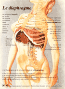 Ce poster édité en 1992 présente le diaphragme dans une vue en volume dans le squelette du tronc. Il permet de bien saisir la forme du muscle en coupole, sa taille, ses attaches et sa structure musculaire et aponévrotique.